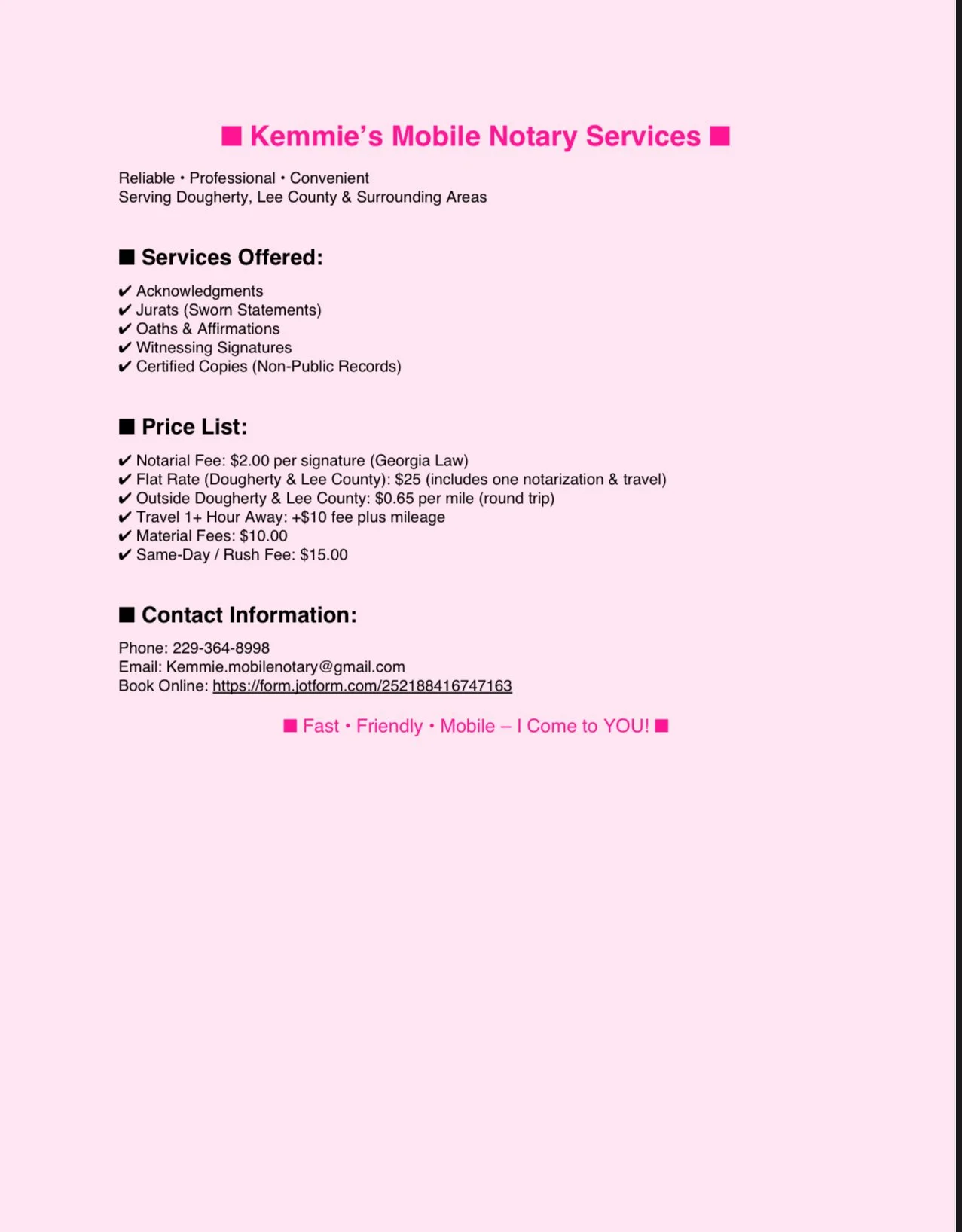Hi, I’m Kemmie Trice, founder of Kemmie’s Mobile Notary Services. I’m a certified and commissioned Notary Public serving Dougherty, Lee County, and the surrounding areas. My goal is to provide professional, reliable, and convenient notary services that make the process smooth and stress-free for my clients.